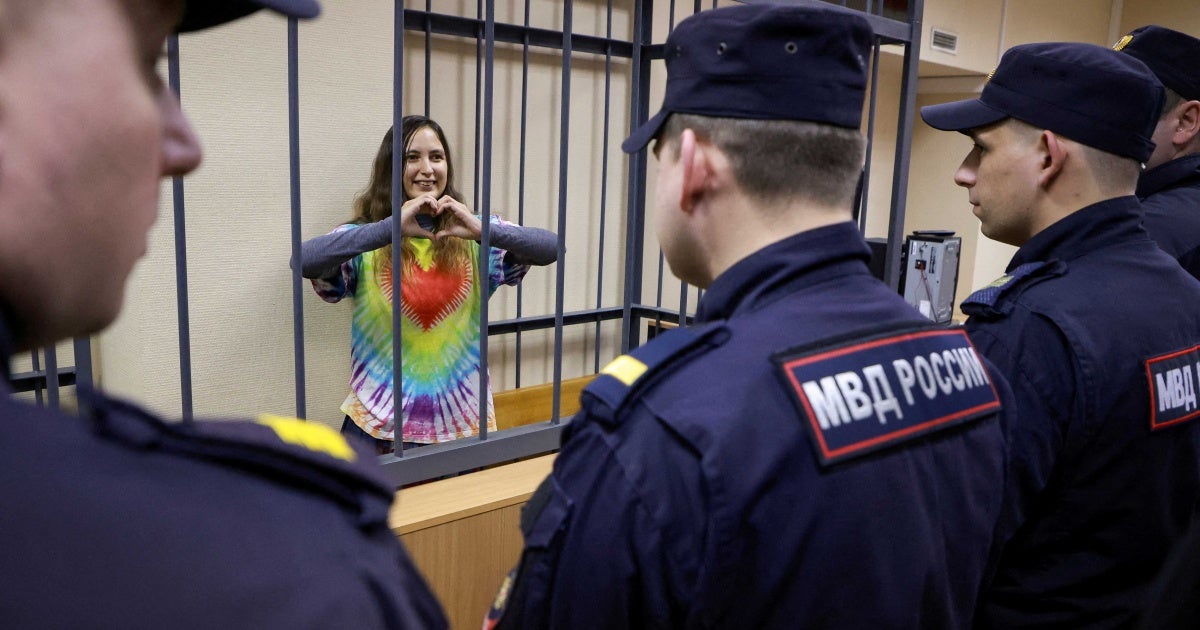Aleksandra (Sasha) Skochilenko, a 33-year-old artist and musician facing charges of spreading false information about the army after replacing supermarket price tags with slogans protesting Russia’s war in Ukraine reacts during a court hearing in St. Petersbur, Russia on November 16, 2023.