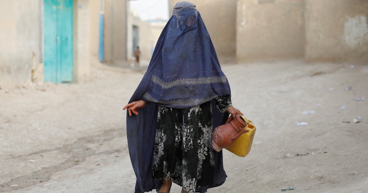 An Afghan woman carries empty containers to fetch water in Nahr-e-Shahi district in Balkh province, Afghanistan, August 6, 2023.